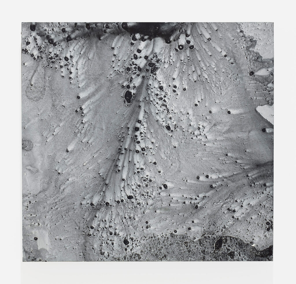 In a similar vein, Andrea Bores Chemor constructs abstract landscapes using organic materials like ink, charcoal, indigo, and water. Letting these materials self-organize during drying to form pictorial structures, she reimagines the landscape through the self-same structures that compose it
