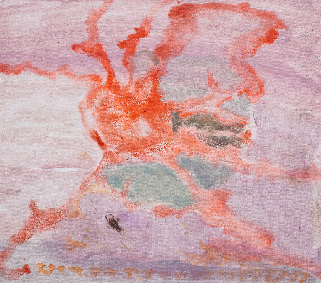 Allowing her paintings to emerge through rhythm, repetition, and revision, Mariana Paniagua embraces an intuitive and non-hierarchical process –with layers of matter accumulating on top of each other to create organic forms. Pigment, wax, oil, and gesture become markers of time, presence, absence, and the histories embedded within material marks. Engaging with the concept of the “metabolized landscape”, Paniagua’s works feature a process of material sedimentation that evokes intimate, uncanny terrains that fuse memory, bodily experience, and nature’s ineffable forces. In a similar vein, Andrea Bores Chemor constructs abstract landscapes using organic materials like ink, charcoal, indigo, and water. Letting these materials self-organize during drying to form pictorial structures, she reimagines the landscape through the self-same structures that compose it –visually tracing dynamic flows and turbulence. Her process is both alchemical and systems-based, revealing the seen and unseen of natural patterns through material agency. Exploring the interplay of light and darkness through layered strokes, Sand Leal creates compositions that oscillate between surface and depth, intentionally blurring the boundaries between painting, drawing, and writing. Privileging the chromatic presence of line as a spatial and organizational force, her abstract paintings dissolve boundaries and treat canvas not as a static field but as a dynamic site where light and form continually emerge and recede.